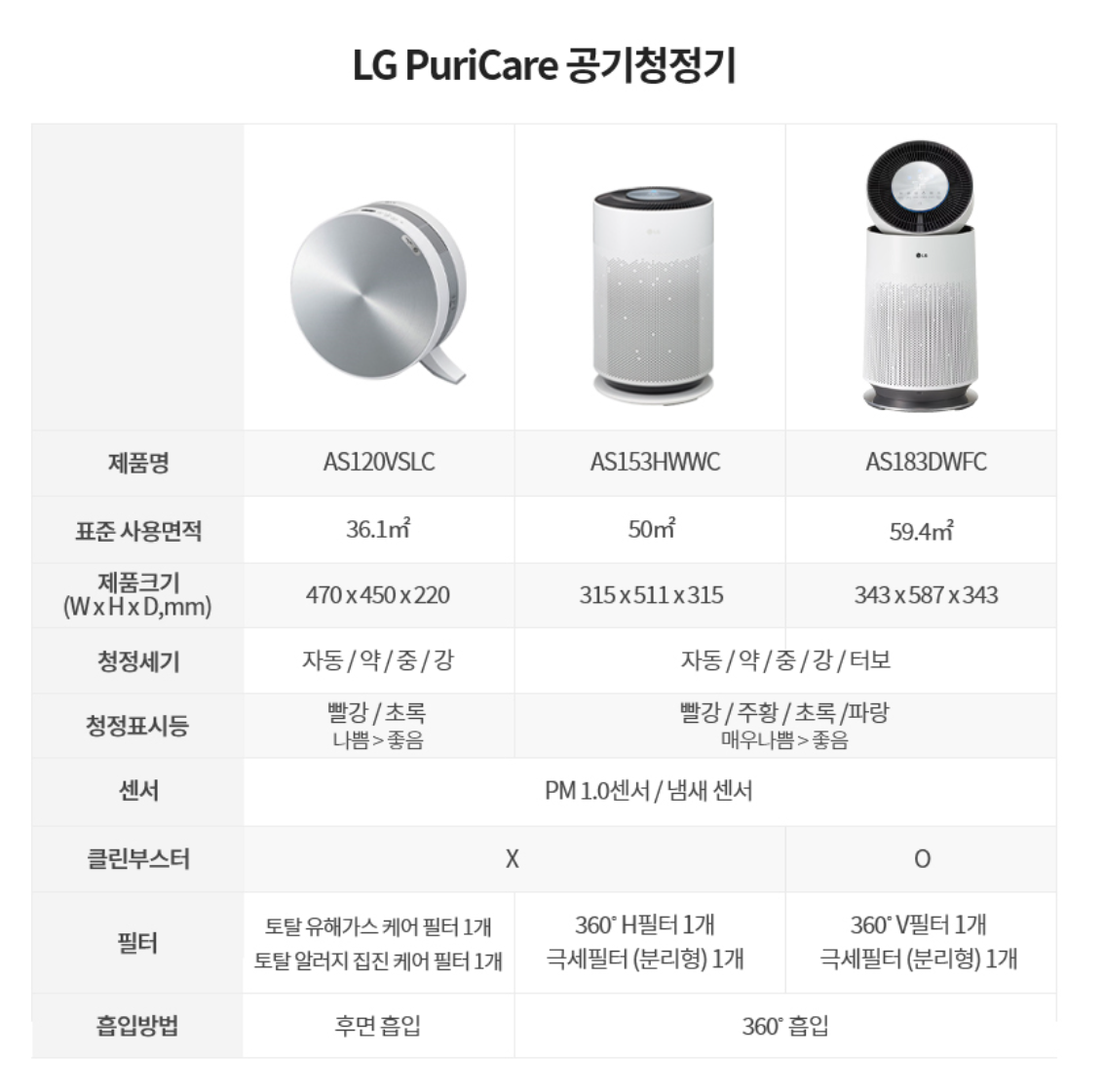 LG 퓨리케어 다른 제품들과 비교 사항입니다. 꼭 제가 산 게 좋은 것은 아니지만 저는 너무 만족스럽습니다.