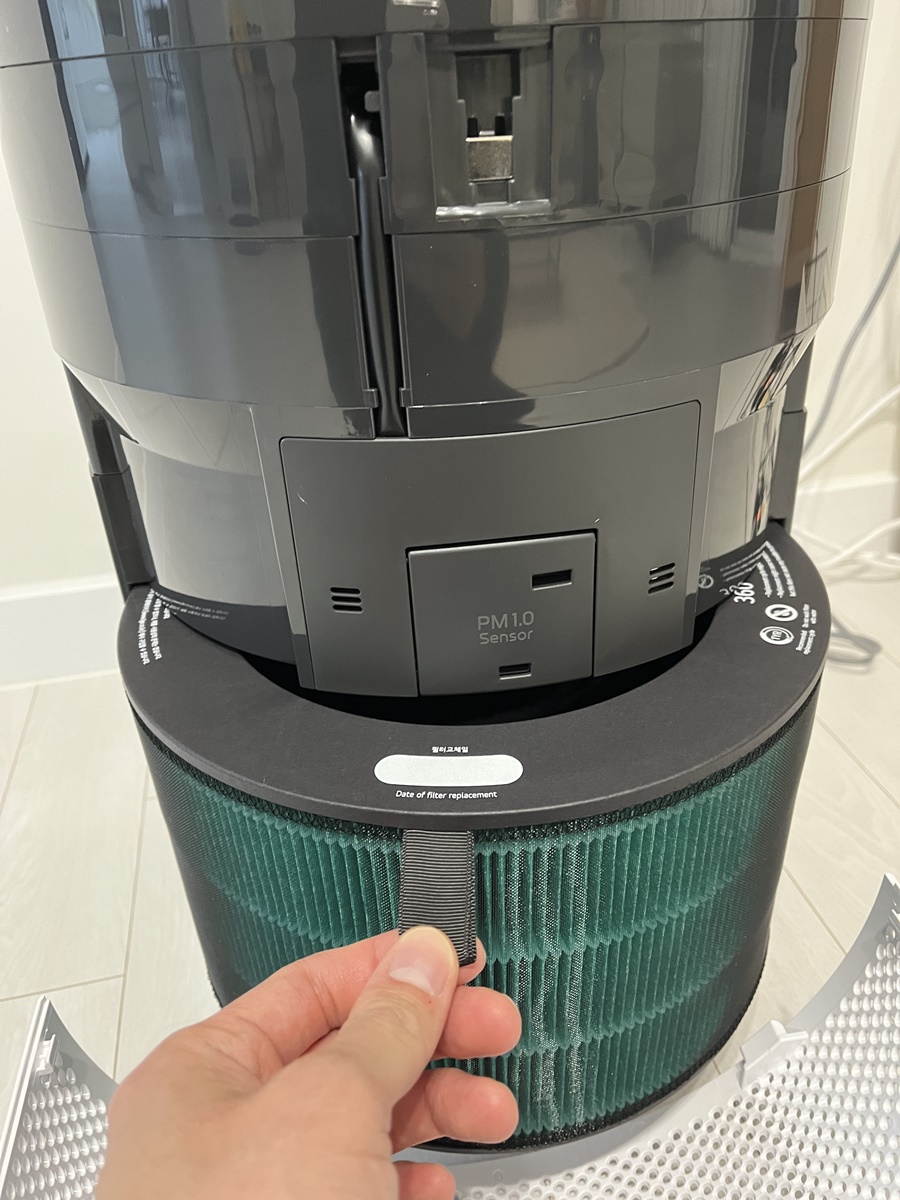 기사님이 설명해 주셨는데 필터는 1년에 한 번 교체하시면 되고요. 필터 청소는 2개월에 한 번 정도 비닐은 물로 씻으시고 안의 필터는 청소기로 빨아주시면 됩니다. 안의 필터는 물에 닿으면 못 써요!