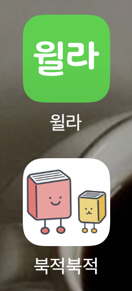 우선 윌라라는 어플은 위의 사진처럼 이러하게 생겼는데요. 저는 밑의 북적북적이라는 어플도 같이 이용하고 있습니다.