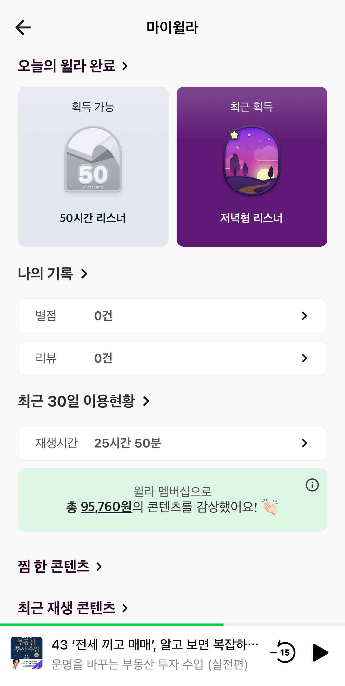 처음에 출퇴근시간에 맨날 유튜브로 보는 것만 보고 그래서 최대한 출퇴근 시간을 자기개발의 시간으로 만들어보고자 윌라를 듣기 시작했습니다 ㅎㅎㅎ