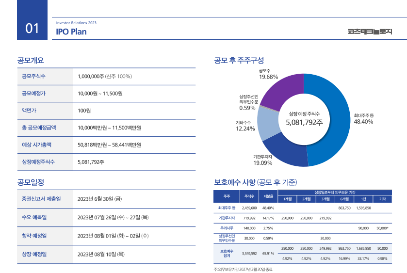 공모청약일은 2023년 8월 1일 ~ 2023년 8월 2일입니다. 환불일은 2023년 8월 4일이고 상장일은 2023년 8월 10일입니다.