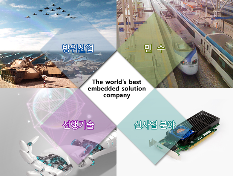 싱글보드컴퓨터(SBC) 기반 방산 임베디드 시스템 대표 기업으로서 최신의 고성능 제품 설계 및 생산을 통해 국가방위산업 발전, 국방기술력 강화에 일익을 담당하고 있는 IT 토털 설루션 업체입니다.
