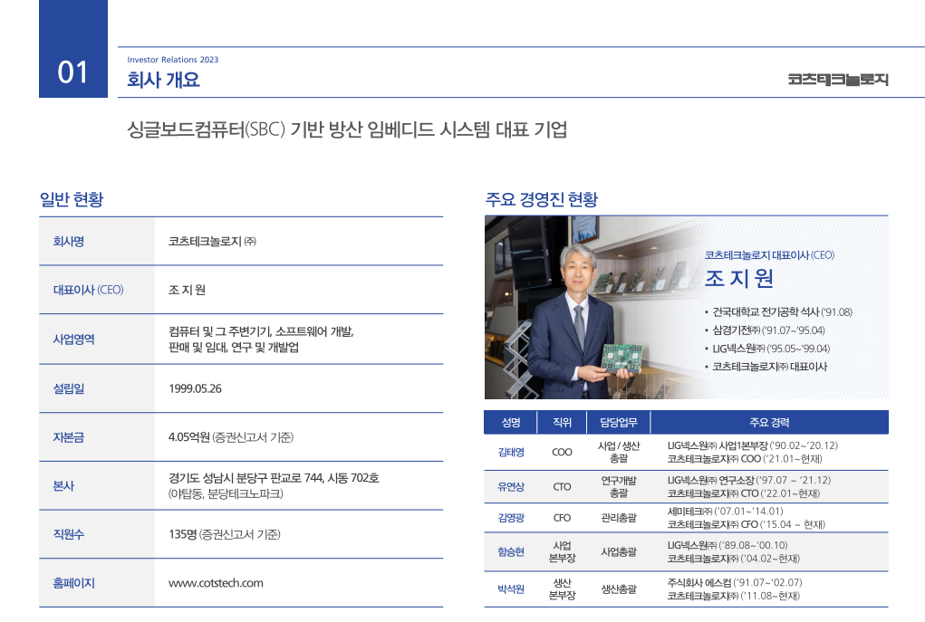 코츠테크놀로지는 업종은 컴퓨터 제조업 기업으로 주요 제품으로는 컴퓨터 주변기기(LCD모니터, CPU보드, DSP보드), 산업용 컴퓨터 제조/전술 통제 S/W 개발이 있습니다.