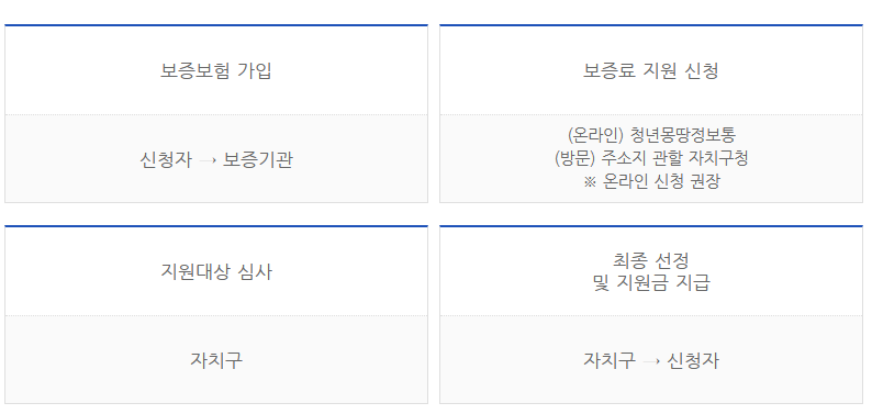 | 지원내용 | 2023년 1월 1일 이후 가입 및 납부완료 한 보증보험료 지원(최대30만원) |